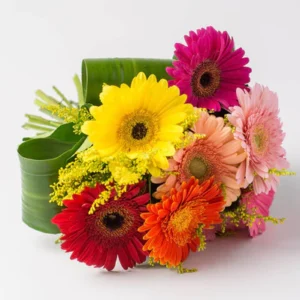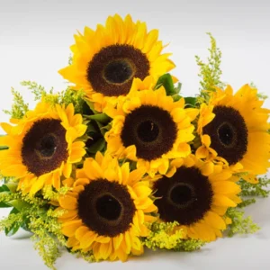 Buque de 8 rosas de cetim com 1 girassol e perolas