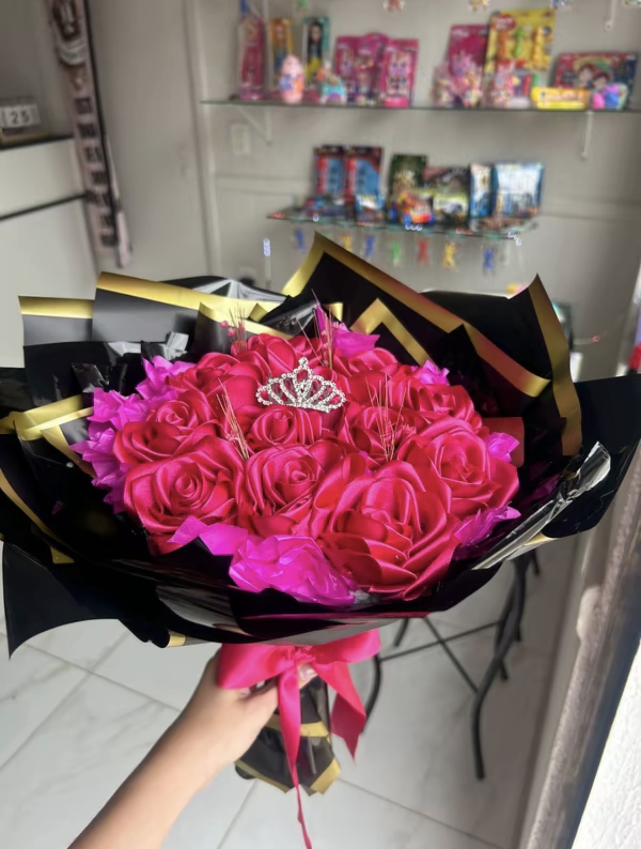 Buque de rosa de cetim com coroa - 12 rosas quantidade