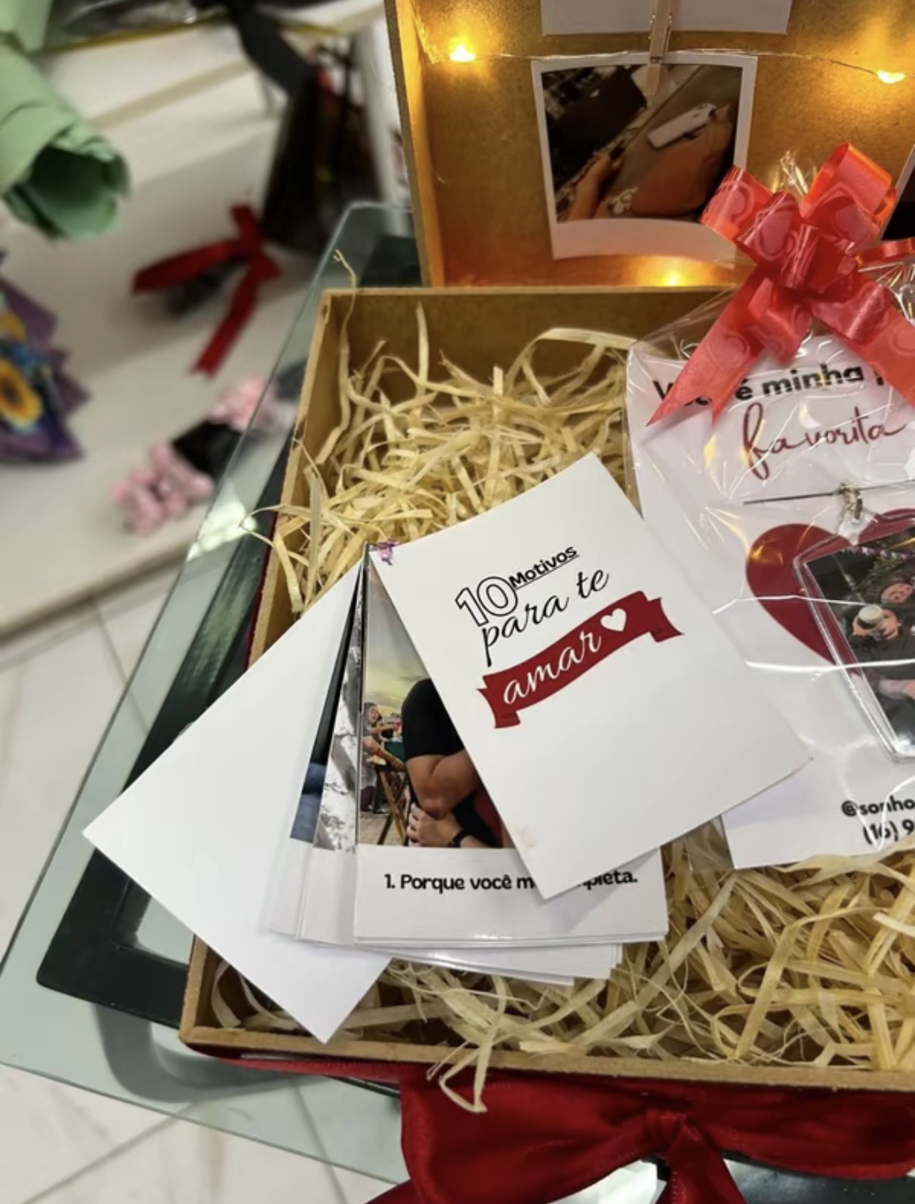 Caixa romantica com fotos,led, chaveiro,10 motivos para te amar quantidade